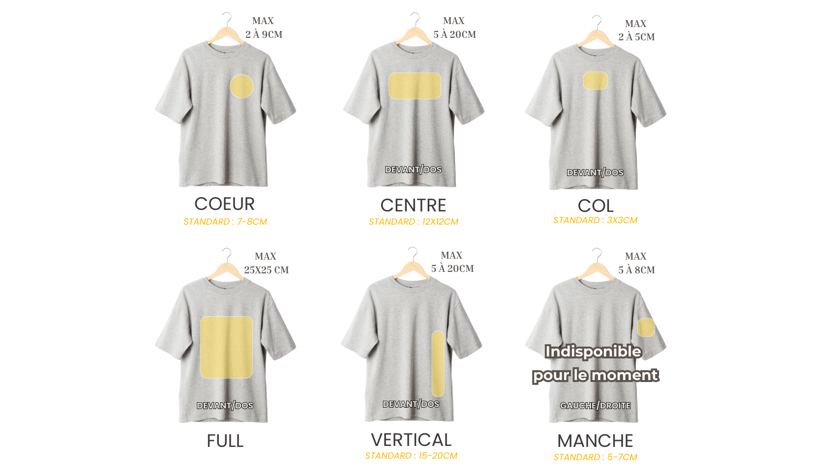 Zones de broderie habituelles sur le haut du corps, ajustables selon le motif.